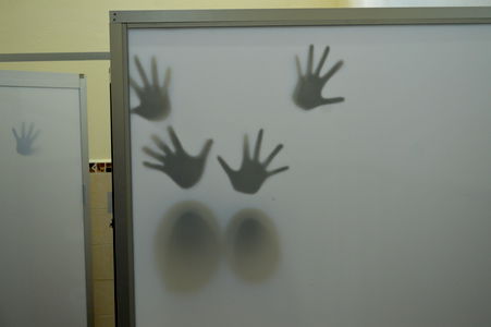 Abraham Jimรฉnez, a model from Mexico, showcasing his physique in a bathroom with blue tiles. A mirror reflects the image of him shirtless.