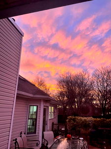 A serene evening scene showcasing a warm pink and purple sky, with trees and a clear horizon. The setting sun casts long shadows on the house and lawn furniture, adding to the tranquil ambiance.