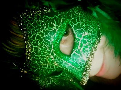 This is a captivating image of the Absinthe an Glas mask, which showcases a striking combination of green and yellow colors. The mask features intricate patterns and designs that add to its allure. The eye cutout on the mask gives it a mysterious aura. This mask could be perfect for a themed party or as a unique decoration.