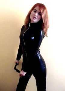 This is a photograph of a female model posing in a leather outfit. She stands confidently with one hand resting on her hip, displaying a stylish and edgy look. The model's attire is characterized by the tight-fitting leather, which contributes to a sense of sophistication and confidence.