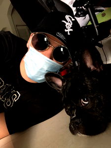 This is a color photograph featuring a person wearing sunglasses, a black dog, and various objects in the background. The image has a casual composition with the model holding the dog against a light-colored surface.