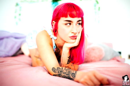 Aby, a striking emo model with tattoos and body piercings, poses confidently. She's wearing dark clothing with lace details, her hair is dyed pink, and she's sporting multiple tattoos on her arms. Aby's eyes are accentuated with dark makeup. She's seated in a room with purple lighting.