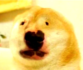 A digitally manipulated dog image, likely from OnlyFans creator acabrocky, shows the dog with a human-like facial expression and an altered nose. It appears to be a humorous representation of the popular meme character.