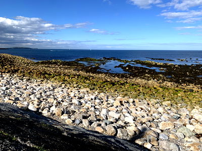 A breathtaking view of the rocky shoreline, featuring a mix of natural beauty with rugged terrain. The clear blue sky meets the tranquil sea, creating a serene landscape for relaxation and reflection.
