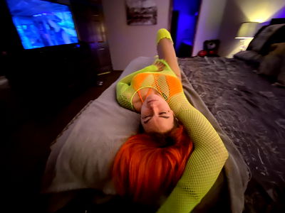 The image showcases a model on the Okalhoma platform, donned in a vibrant and revealing outfit that suggests a strong presence on the platform. She is lying on her back with one hand on her head, exuding a sense of confidence and allure.
