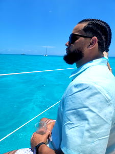 Model posing on a boat with blue ocean in the background. He is wearing a light blue shirt and dark sunglasses.