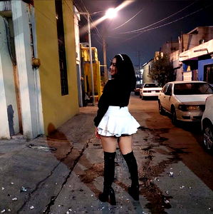OnlyFans model China posing on street. She is standing in front of a building, looking to the side with a coy smile. Her outfit suggests she might be attending a party or a social event.