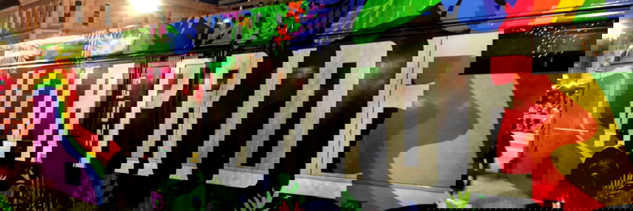 Vibrant and diverse mural on bus, promoting unity with message 'Welcome to Our Rainbow Village'. Onlyfans model name: Achris07. Based in Austin, TX.