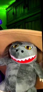 AcidGelipe, an Onlyfans model, is seen in cosplay, sporting a purple outfit. She's holding a stuffed monkey and seems to be posing for a picture on a platform with a green backdrop.