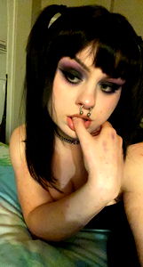 This image features a model with tattoos, makeup, and a punk-rock style. The individual has long black hair, is wearing a necklace, and appears to be making a playful or provocative expression. The background suggests this might be taken in an urban setting.