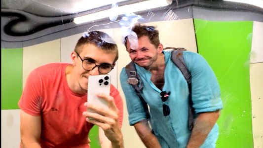 This is a fun and creative mirror selfie. The photo captures the reflection of two men taking the photo, which adds an interesting element to the image.