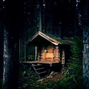 A rustic log cabin nestled deep within the woods, surrounded by tall trees and offering a peaceful retreat from urban life.