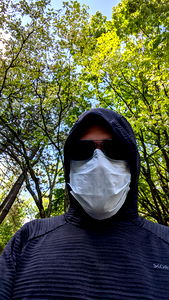 An individual in a hooded sweatshirt, with sunlit trees behind. Mask and sunglasses suggest caution and enjoyment of the outdoors.