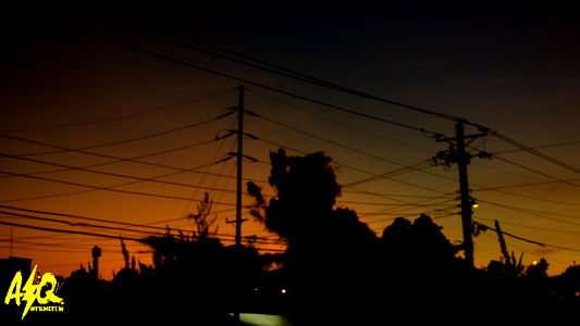 An evening scene featuring telephone poles and power lines against a vibrant sunset. The image captures the quiet solitude of urban life. #YoungJirayaยฎ, the photographer's signature model.
