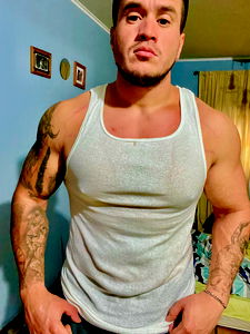 A man from OnlyFans posing in a casual tank top. He stands in front of a blue wall with tattoos visible on his right arm.