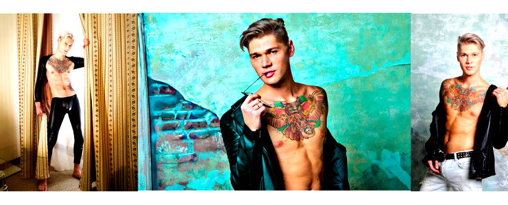 A European model showcasing his physique, wearing red underwear and a blue shirt. The image features him posing in an armchair with tattoos and piercings visible.