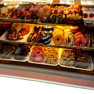 The image showcases an enticing assortment of pastries, donuts, and cakes with various toppings. The display case is neatly organized, presenting a visually appealing selection of sweet treats. The case is likely located in a bakery or pastry shop.