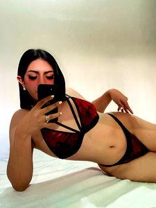 Beautiful OnlyFans model from Colombia, Adahnessa, showcases her stunning beauty and confidence in this image. She is wearing a lingerie outfit that accentuates her physique. With her phone in hand, she captures her moment on the bed. Her striking pose adds an element of intrigue to the scene.
