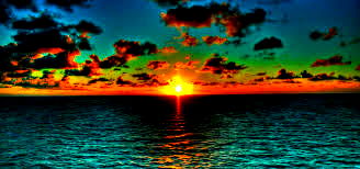 Experience the breathtaking beauty of a vibrant sunset over the ocean, with dark blue waters stretching out to meet the colorful horizon. The sky is alive with hues of orange and pink, creating a stunning backdrop for this tranquil scene.