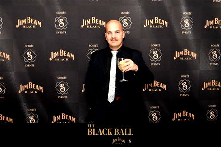 An OnlyFans model is present at the Black Ball event. He holds a drink and poses for the camera, looking sharp in his black suit.