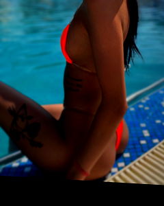 A lively scene featuring OnlyFans model Carla Adam lounging on a poolside bench, radiating energy and confidence. She's clad in a vibrant bikini, which adds a pop of color to the serene backdrop.