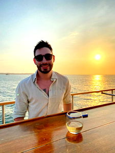 Adamsaints2020, the Colombian model, shares a moment of tranquility at sunset, with a breathtaking ocean view and a cold drink at hand. Embrace the calmness before the hustle of the night.