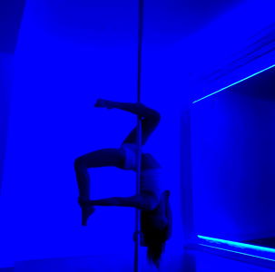 An athletic and confident individual showcasing their pole dancing skills in a striking blue room. They are upside down on a dance pole, embodying the grace and strength of the sport.