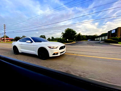Experience the thrill of driving a sleek white 2021 Ford Mustang on a clear day. This powerful sports car is equipped with a black spoiler and black rims, ready to take on the open road.