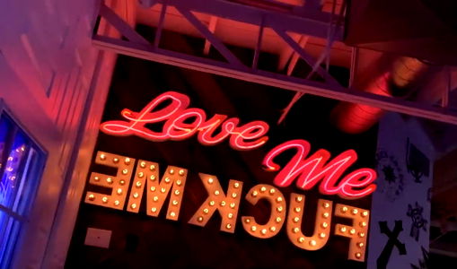The image displays a vibrant neon sign in a bar setting. The text on the sign is 'Love Me, Tequila' and there are also additional texts like 'Freak Show'. The overall atmosphere suggests a lively and energetic ambiance typical of a social gathering venue. Onlyfans model name: addilynn