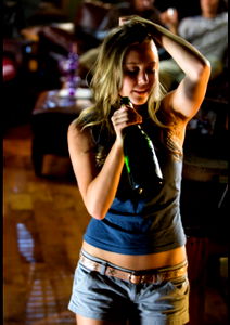 Addi, an OnlyFans model, is captured in her element. She's engaged in a lively bar scene where the atmosphere seems to be buzzing with excitement. She's holding a bottle of champagne, ready to toast to the joyous occasion. Her pose suggests she's having a great time and enjoying herself amidst the celebration.