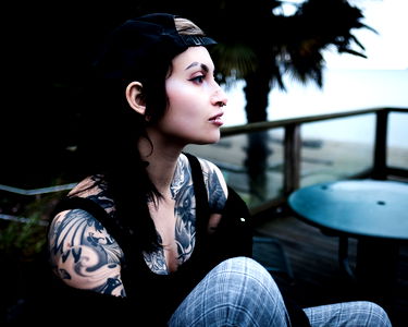 An expressive model showcases her tattooed arm, capturing the essence of alternative and tattoo culture.