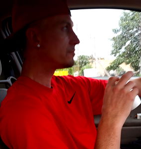 Captain Save A Hoe enjoys a ride in his car, possibly on the way to or from an exciting event. He's casually dressed and appears relaxed.