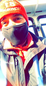 Meet Austin, a passionate urban cyclist. With his bright red hat and matching mask, he's ready to take on the city streets. His black jacket is complemented by a backpack, essential for any modern commuter.