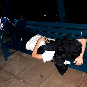 A young man in a blue jacket stands alone in an empty parking lot at dusk. He gazes into the distance, with the city skyline faintly visible against the twilight sky.