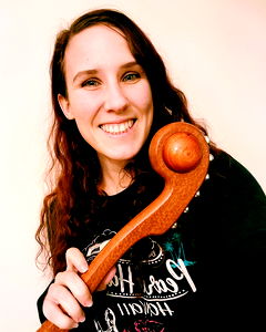 A smiling young woman is holding a wooden megaphone. She has long hair and is standing against a light background.