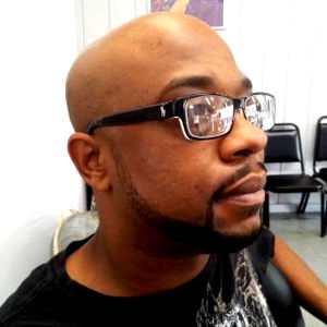 This image depicts an African American man wearing glasses, sitting in what appears to be a barbershop. He is looking directly at the camera, giving a contemplative expression. The lighting in the room illuminates his face, highlighting his features.