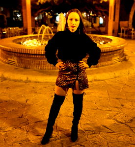 The model is striking a pose, dressed in a stylish outfit with high boots. The backdrop features a fountain and lights, adding to the urban night vibe.