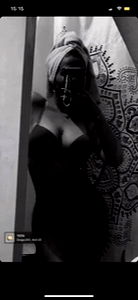 In the image, a young woman with long hair is seen taking a selfie. She is wearing a black top and has her arms resting on her head. The background of the photo is blurred, but it appears to be indoors with a blue wall. The woman's pose suggests she might be in a relaxed or intimate moment.