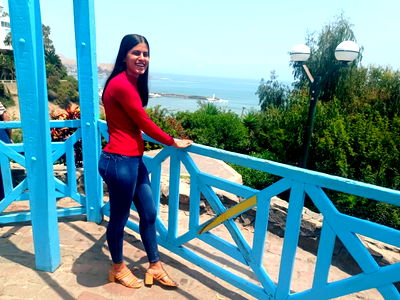 Adriana, the Chilean model, is seen enjoying the view from an elevated platform with her hand on the railing. She wears a vibrant red top paired with a blue denim jacket, completing the look with white sneakers and gold hoop earrings. Her stance exudes confidence as she takes in the panoramic view of the ocean and coastline below.