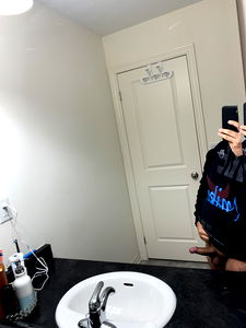 The image is of a person taking a selfie in a bathroom mirror. The individual is wearing a black sweatshirt and appears to be standing by the sink. The environment suggests a private residential setting with a clean, minimalist aesthetic.