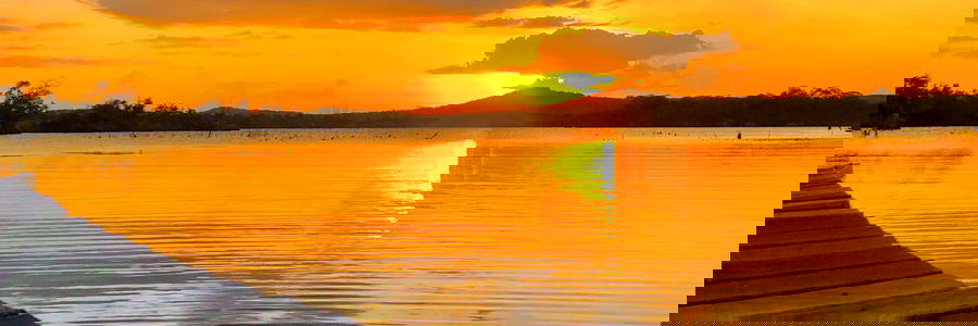 A serene sunset reflecting off the water, with a wooden dock and calm waters. The sky transitions from warm orange to cool blue hues.