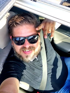 A man with a beard and mustache sits in the passenger seat of a car. He has dark hair, is wearing a blue shirt, and seems to be looking out of the vehicle window.