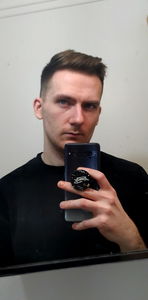 A young male model from Lake Louise showcasing his look. He is holding up a phone in a mirror reflection.
