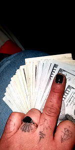 A candid moment from the exclusive world of Adubz. The image features a stack of cash and a finger pointing directly at it, hinting at the financial success in their adult content career.