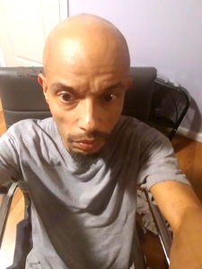 The image depicts a man with a bald head, taking a selfie in his home. He is seated on what appears to be an office chair and has a neutral expression on his face. The background suggests an indoor setting, possibly a living room or study area. The photo captures a casual, everyday moment.