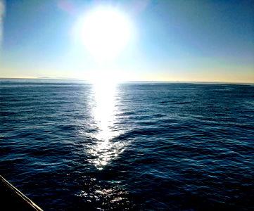 Enjoy the serene view of a sunset over the ocean, captured from the deck of a boat. A perfect getaway for those who love the water.