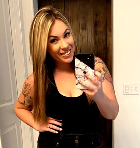 This image features Amber, a tattooed woman with long brown hair. She is striking a pose in front of a mirror, flaunting her black eye shadow that adds an edgy touch to her look. Her outfit consists of a black tank top, paired with blue jeans. The only visible text in the image is 'Amberโก๏ธ๐คโก๏ธ', which seems to be her OnlyFans username or handle. She appears to be in her mid-20s and the photo captures her confident and stylish persona.