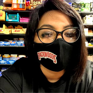 A confident, happy woman wearing glasses and a top. She has short hair and is smiling. A selfie in the background suggests she's at home. Her attire and accessories might indicate an office or work environment.