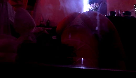 A lively indoor gathering, with a person standing by a red light, possibly DJing or performing. The atmosphere is enhanced by smoke and vibrant colors.
