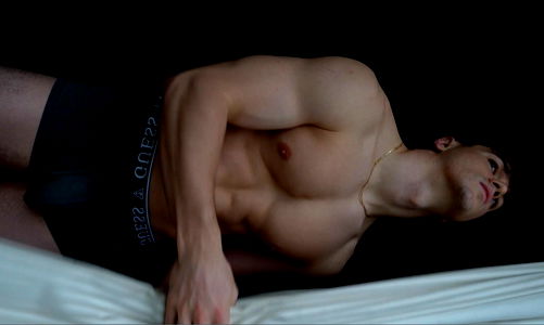 A gym-toned young man with tattoos poses shirtless in front of a bathroom mirror. He holds up a towel, showcasing his physique and tattoos.